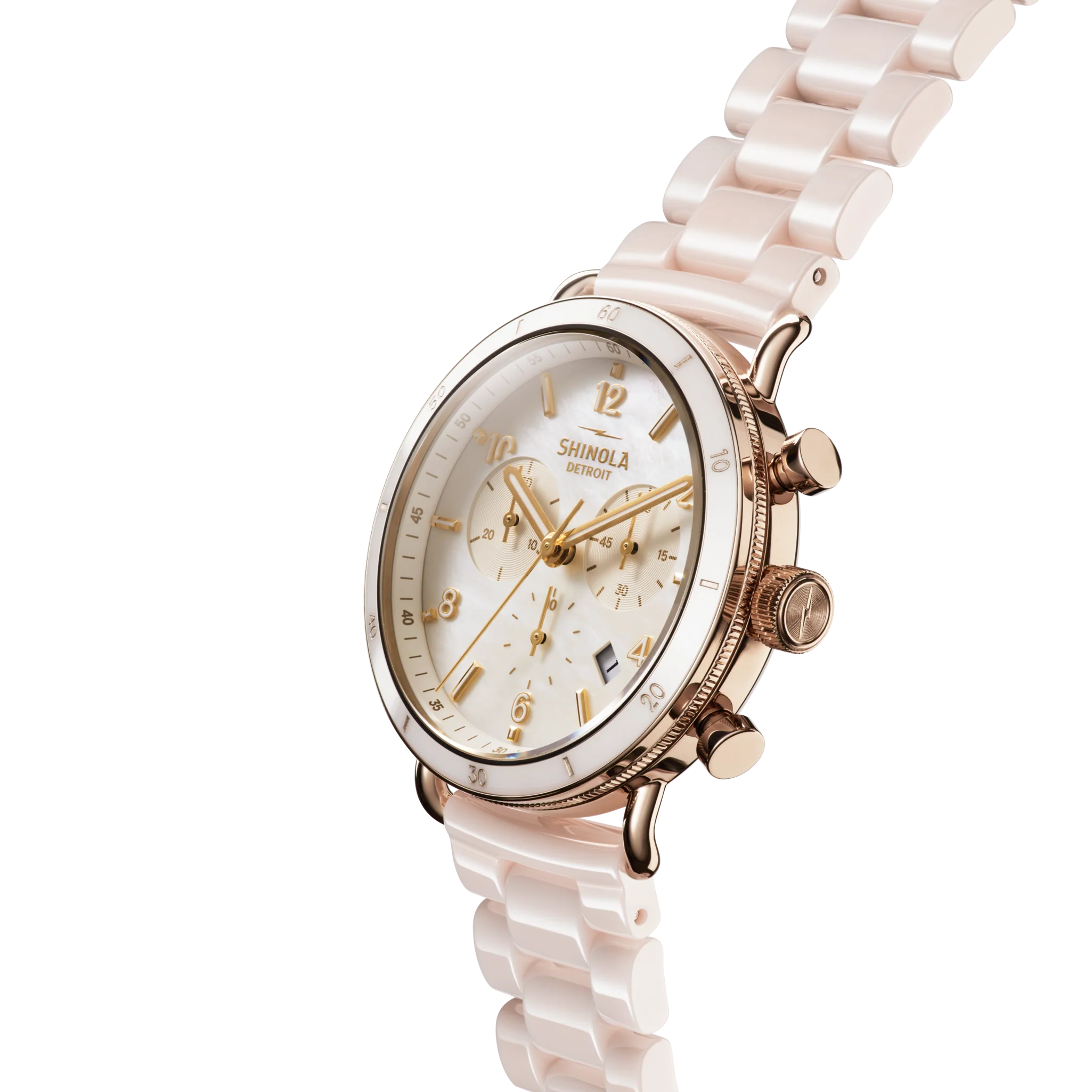 Featuring mother-of-pearl dial, blush ceramic bracelet, and champagne gold accents all around, the 40mm Canfield Sport by Shinola is stand-out in more ways than one. But Its just as impressive inside three-eye chronograph movement powers this heirloom-worthy timepiece. The champagne gold PVD steel case is encircled by fixed bezel with blush ceramic insert, and the look is complemented by the ultimate accessory: scratch-resistant, durable and lightweight ceramic three-link bracelet in radiant blush pink. Sporty but refined, the Canfield Sport is timeless and in this sophisticated colorway, It's quintessential piece for your wardrobe.