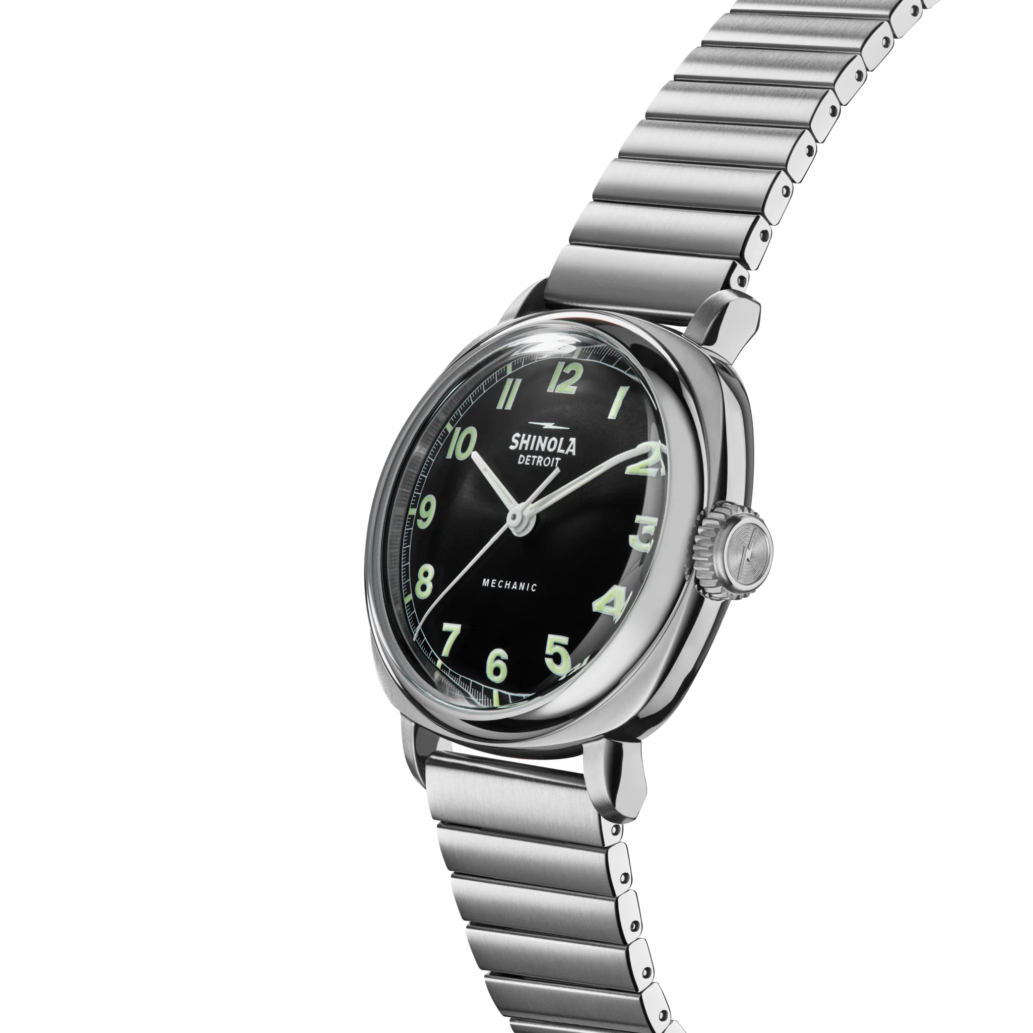 The Mechanic is hand-wound mechanical watch that honors the simple, tactile analog experiences of life. In keeping with Its throwback design, the Mechanic features domed black dial, box crystal, curved hands, and toothy crown for easy winding. An exhibition case back window reveals the mechanical manual-wind movement. Finished with brushed stainless steel tapered bar link bracelet, the Mechanic is truly unique addition to the watch lovers repertoire, with plucky wind-it-yourself attitude and style to spare. The Mechanic has a minimum power reserve of 42 hours.